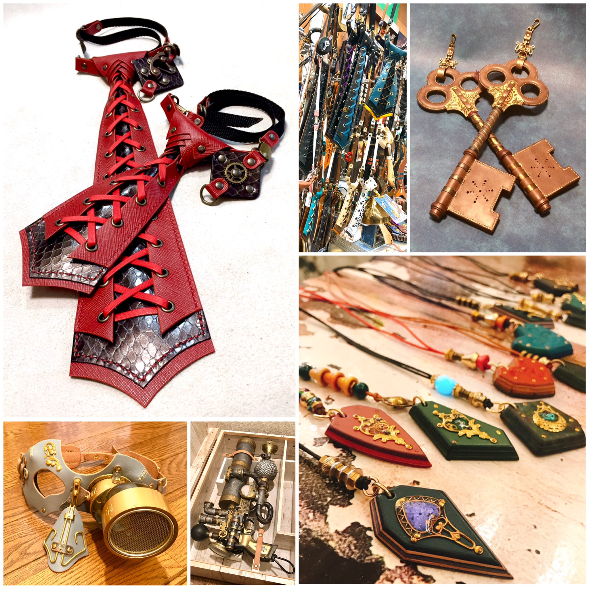 コルセットディテールを取り込んだ“レザーネクタイ”、鍵型パスケース“魔導の鍵” など、様々な日常使いのファッション雑貨からSF味溢れる特殊小道具まで、handmanoのブースは常に多彩なアイテムで溢れている。