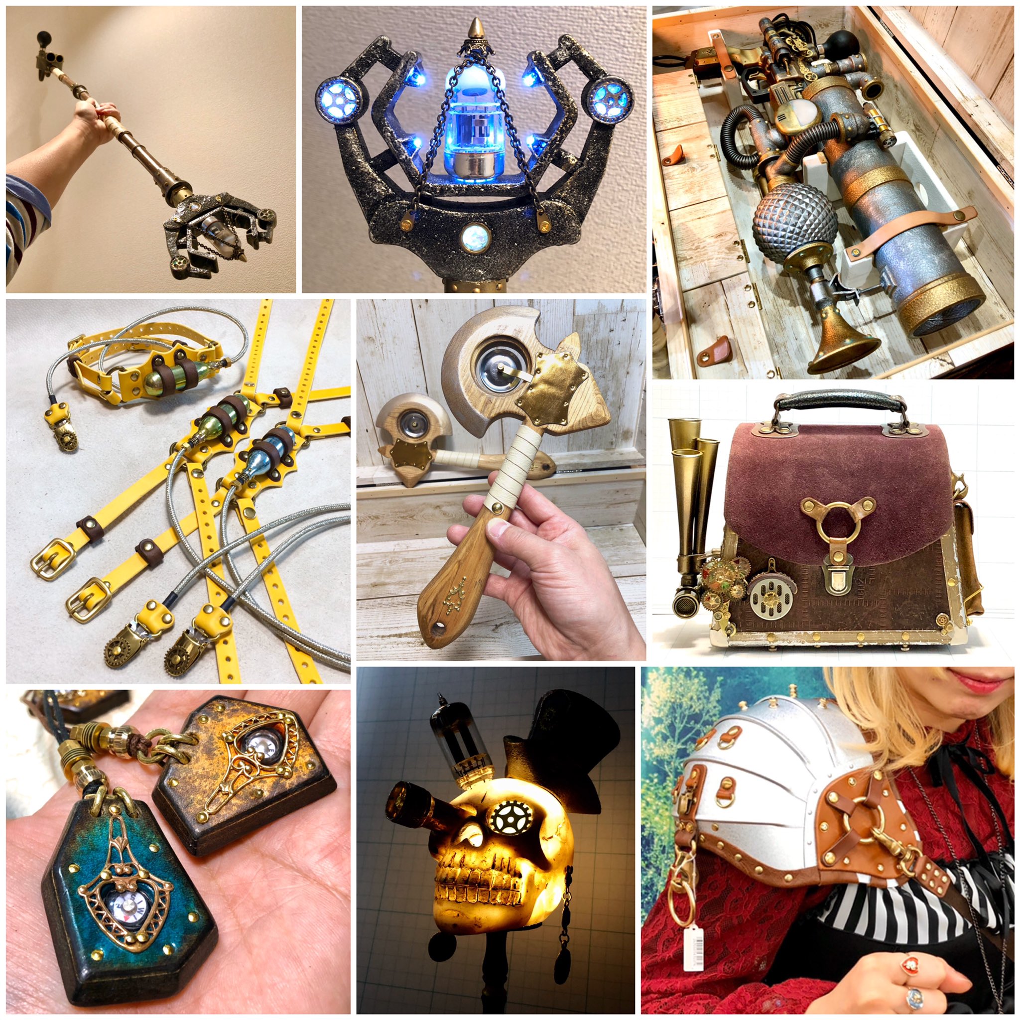 ガジェットエンジニアhandmanoが生み出すアイテムは 装飾品・装備品・生活用品 etc...と多種多様。扱う素材は様々、閃きと共にスチームパンクな魅力溢れる特殊小道具やレザー製のファッションアイテムなど 自由な発想で幅広く手掛ける。年に数度、ハンドメイドイベントへの出展を行う。遊び心と共にあなたの冒険に必要な一品を見つけてください。